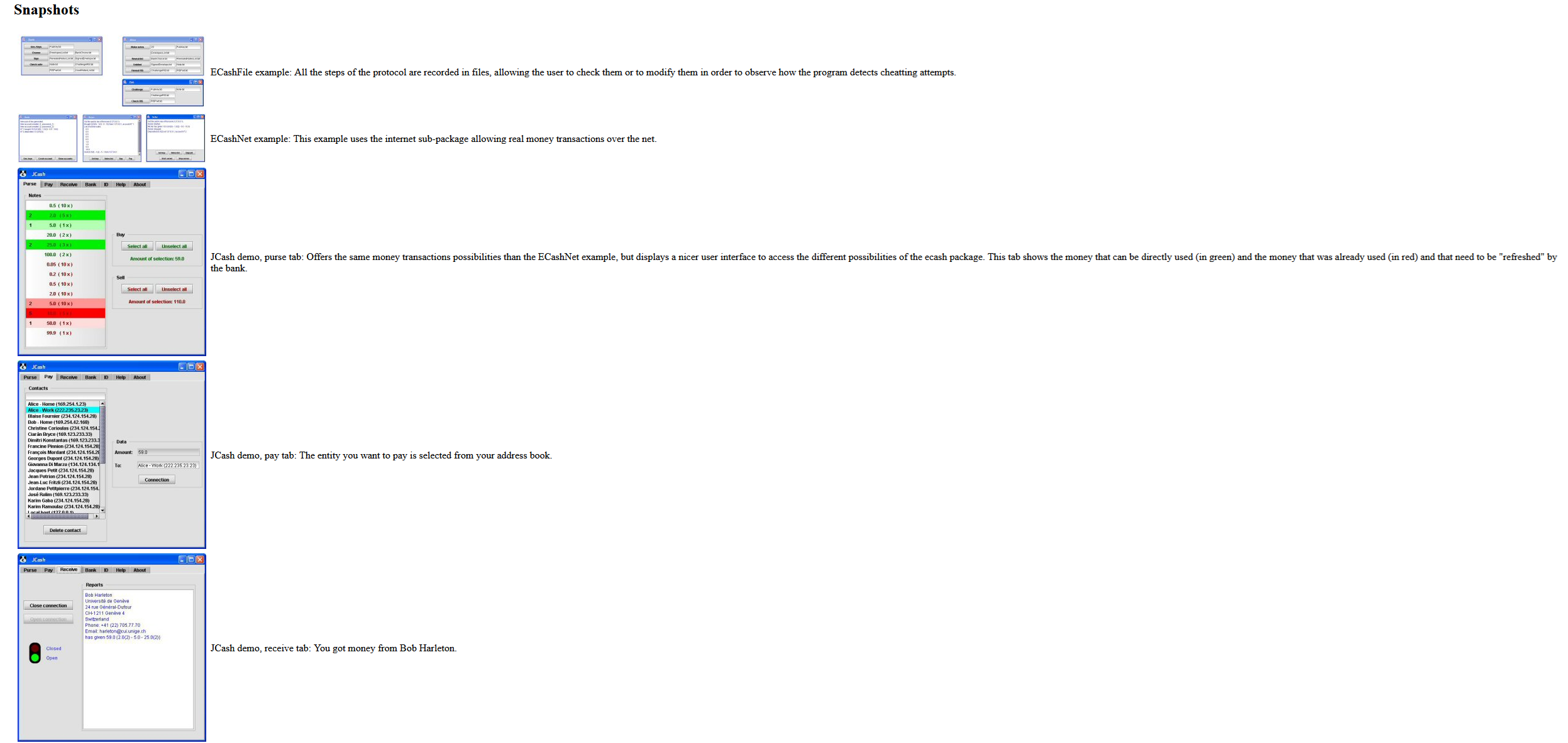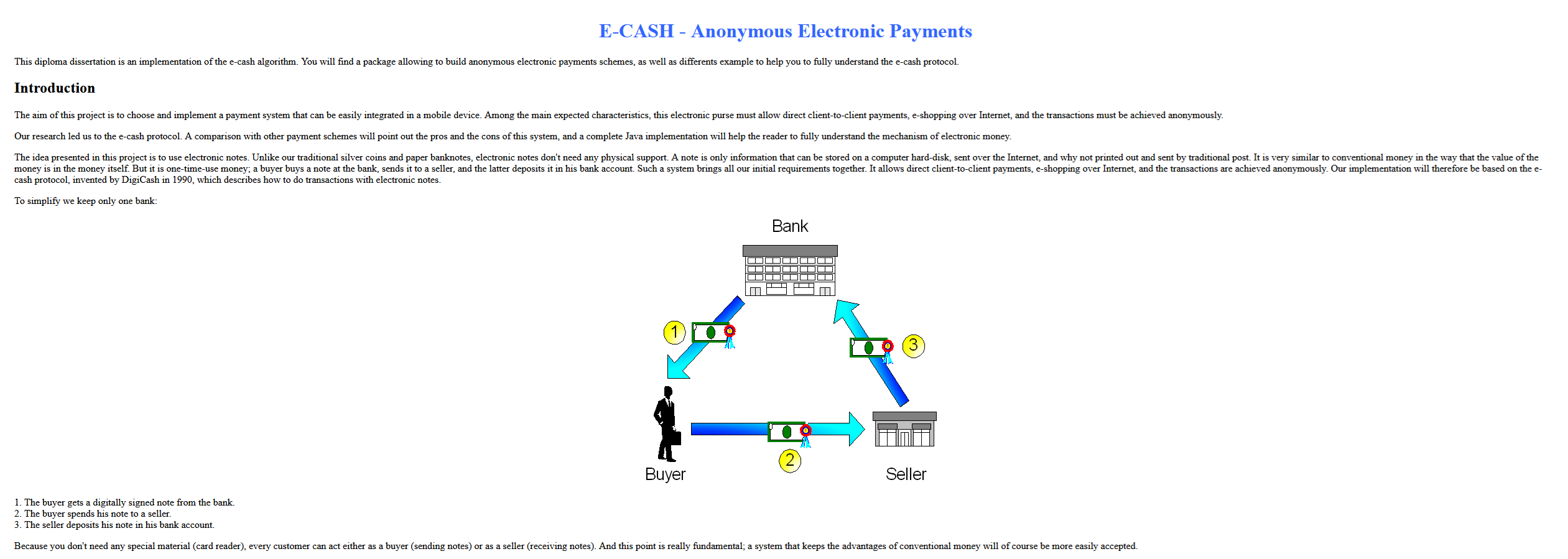 | E-CASH | An implementation of the e-cash algorithm, allowing users to make anonymous electronic payments over the Internet | 2003 |